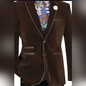 MEN'S VINCI SINGLE BREAST BROWN VELVET SLIMFIT SPT. COAT W/ FAUX LEATHER TRIM.