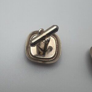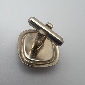 These vintage cufflinks feature a intricate pattern with a red plastic gem in a gold tone setting. The design adds a touch of classic elegance to any formal outfit, making them a stylish accessory for men. Perfect for those who appreciate unique and eye-catching details in their cufflinks.