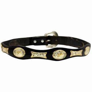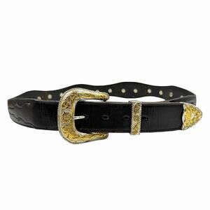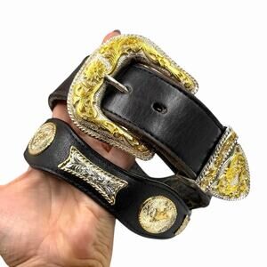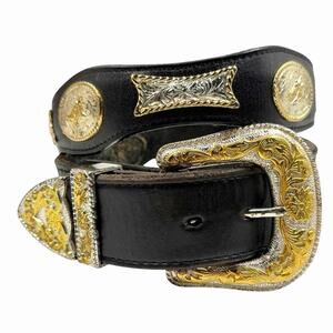 MENS VTG WESTERN CONCHO BELT BLACK LEATHER SILVER & GOLD RODEO COWBOY MEXICO 32