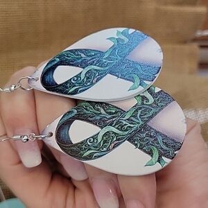 Wooden teardrops with double sided image. Green ribbon for mental health awareness; botanical accents for "growing positive thoughts". Hypoallergenic wires.