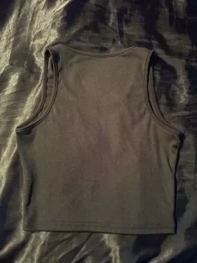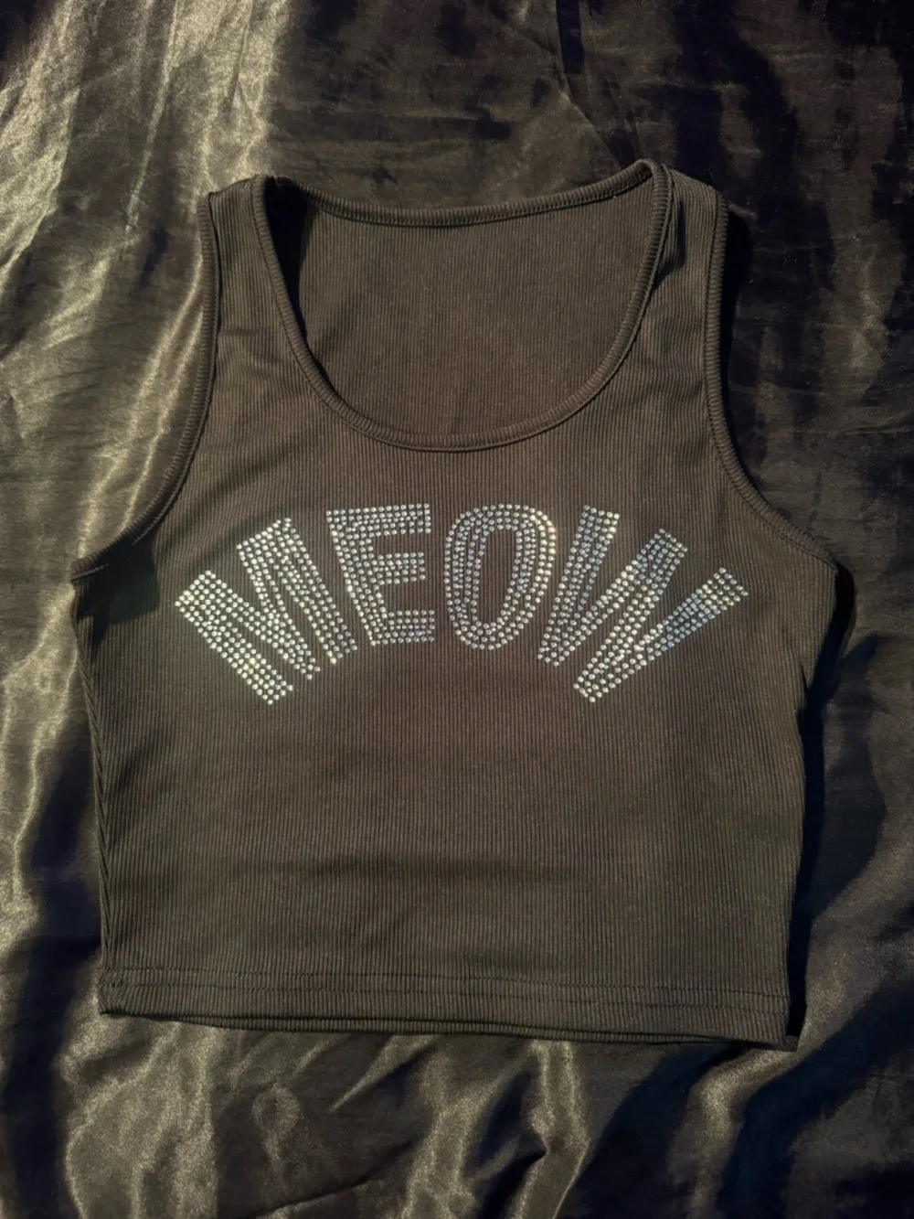 Black ribbed tank top with sparkling rhinestone "MEOW" graphic across front. Stretchy ribbed fabric and scoop neckline. Eye-catching rhinestone lettering for a playful look.