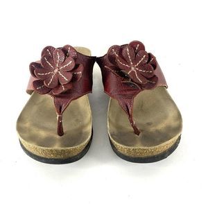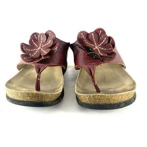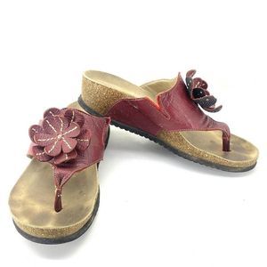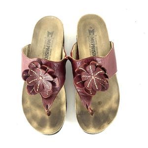 MEPHISTO VIOLETTE DARK RED LEATHER FLORAL THONG SLIDE PLATFORM SANDALS 39