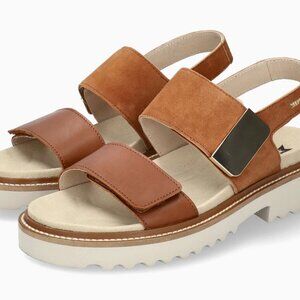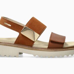This sandal can be adapted to suit all styles and tastes. The SOFT-AIR midsole and SHOCK-ABSORBER integrated into the outsole reduce shock to a minimum for a smooth, fatigue-free walk. AIR-RELAX technology respects the anatomy of the foot to prevent arch collapse. They combine comfort with a perfect fit thanks to adjustable hook-and-loop straps, one of which is embellished with a metallic ornament for a touch of fantasy. The leather lining ensures a healthy climate inside the shoe. This brown sandal for women is made of suede leather on the front and smooth leather on the back.