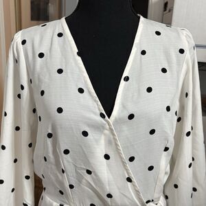 MERAKI Peplum Faux Wrap Blouse Long Sleeves White With Black Dots