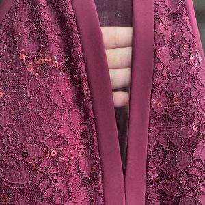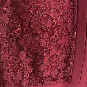 Gorgeous evening dress! Worn just once as a bridesmaids dress! Is hemmed as it was initially too long. I’m only 5’1. The slit was also altered to make it slightly higher up the thigh. Beautiful merlot color. Review pictures. Item is sold as is.