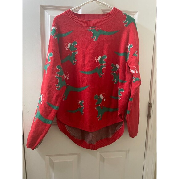 MEROKEETY T-REX DINOSAUR all over UGLY CHRISTMAS TUNIC SWEATER Women’s L