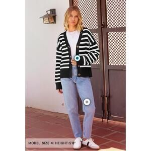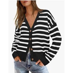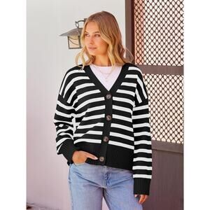 Features: Striped, v-neck, button down, open front, long sleeve, drop shoulder, slouchy, ribbed hem and cuffs, no pockets, casual cardigan sweater for fall, women's cardigan for work casual.