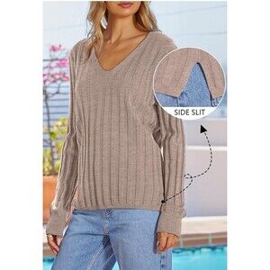 Features: Long sleeve, v neck, small side slit, solid color, ribbed knit, stretchy slim fitted, standard length, basic style, classic and versatile, sweaters for women trendy,