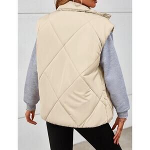 Zip front with snap placket, quilted design, sleeveless jacket, stand-up collar, solid color, lightweight, warm and soft, two side pockets, hemline with adjustable drawstrings