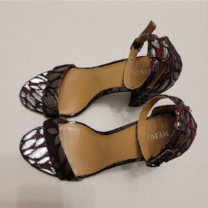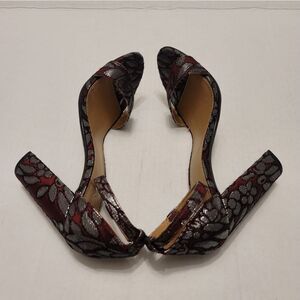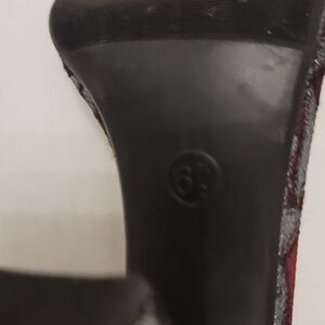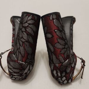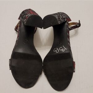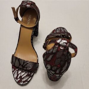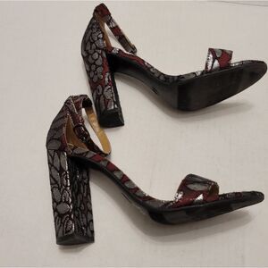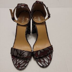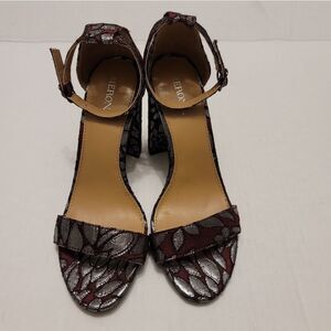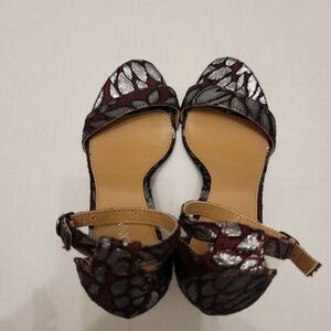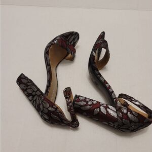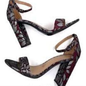 MERONA LULU FLORAL EMBROIDERED BLOCK HEEL SANDAL SIZE 61/2 COLOR BURGUNDY& SILVER PRINT ONE STRAP ALMOND TOE ADJUSTABLE BUCKLE ANKLE STRAP CLOSURE MADE WITH ALL MAN-MADE MATERIALS LINING UPPER TEXTILE BALANCE MANMADE MATERIALS HEEL HEIGHT MEASUREMENTS APPROX