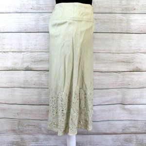 Lovely linen, a-line skirt is a true midi length, with understated sequin embellishment around the bottom third. Features a side zip and wide tailored waist, the color is somewhere between a sage and olive green and a light tan/khaki depending on the light. Excellent Like- New condition, Never Worn so no spots or stains, no rips, tears, or pulls - no defects noticed.