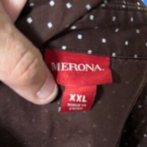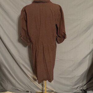 The Merona Polka Dot Dress in size 2X is a stylish button-up dress designed for women in a plus size. The brown and white polka dot pattern adds a fun and feminine touch to the knee-length dress, while the 3/4 roll tab sleeves and collared neckline provide a classic and elegant look. With a relaxed fit and a button closure, this dress is both comfortable and chic, making it a great choice for everyday wear or a casual occasion.