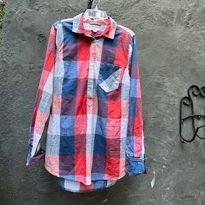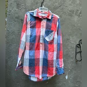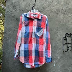 MERONA RED WHITE BLUE PLAID HALF BUTTON UP LONG SLEEVE SHIRT TUNIC TOP SIZE S