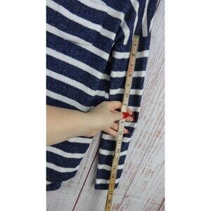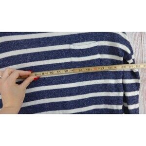 The Merona Tee Shirt for women in XS size features a navy blue and white stripe pattern, perfect for a nautical theme. This long sleeve shirt with a round neckline and pullover closure is versatile for both travel and casual occasions. Made from a blend of spandex, cotton, and modal, this knit shirt offers a comfortable stretch fit. The tagless design and collarless style make it a basic yet stylish addition to any wardrobe, fitting for all seasons and various themes such as hipster, marine, and colorful.