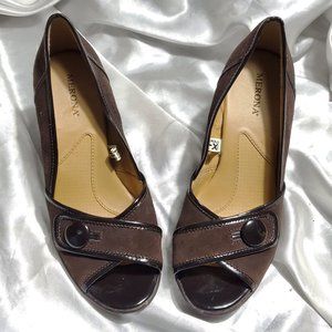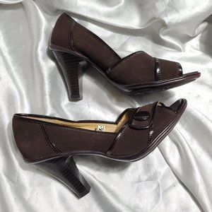 $$$ MERONA vintage style brown suede open toe heels with patent accents SZ 5.5M