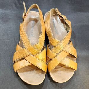 MERRELL BABSON LEATHER ANKLE STRAP SANDALS SIZE 6 COLOR TAN OPEN-TOE CRISSCROSS STRAP ADJUSTABLE BUCKLE ANKLE STRAP CLOSURE MADE WITH ALL MAN-MADE MATERIALS LINING BALANCE MAN MADE CUSHIONED FOOTBED THIS ITEMS IS PRE-OWNED EXCELLENT CONDITION WITH ONLY LIGHT SIGNS OF WEAR IF ANY CHECK THE PICTURES