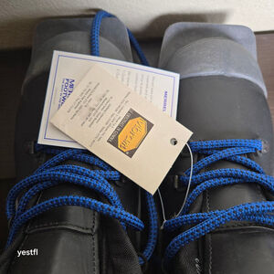 Merrell fts ski boots, size Women's 8 (UK 6.5, EUR 40), in black leather and gray rubber. Features include blue laces, Vibram soles, and a padded collar. The boots are new with tags and in their original box. 5410.