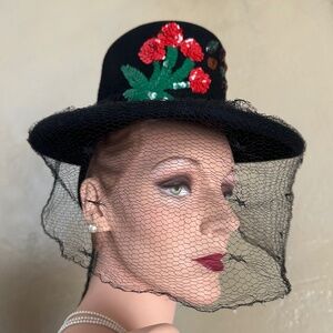 This is an outstanding tilt hat from the fabulous 40s' made of black felt. The tall, tubular crown is flat at the top, and is surrounded by a medium width brim. There is a full spider veil, which can be tucked in around the brim. The brilliant sequin flower plus the jewels on the brim make this design unique. There is an elastic band attached to the inside of the hat to hold the hat in a tilted position. This hat is a collector's dream!