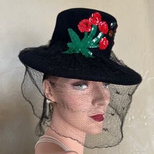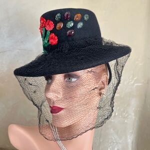MERRY 1940s' BLACK FELT TILT HAT WITH SEQUIN FLOWER APPLIQUE, JEWELS, FULL VEIL