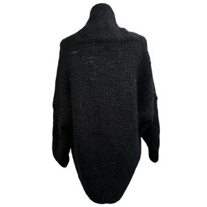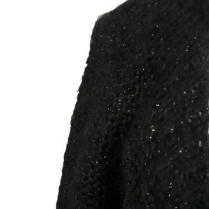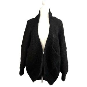 Gently pre-owned. No rips or stains. Fuzzy open weave cocoon-style open front cardigan. Back with metallic silver threads woven thru out. Pockets at front.