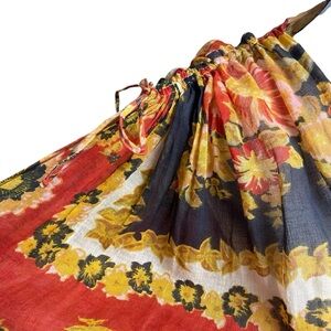 It has a tan background with floral designs of rust, gold, black, and olive green.