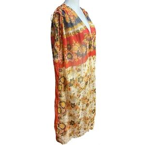 Cotton long floral kimono with snap front closure and tie detail at sleeves. Relaxed, flowy fit. V neck. Made with 100% Cotton. Dry clean only.