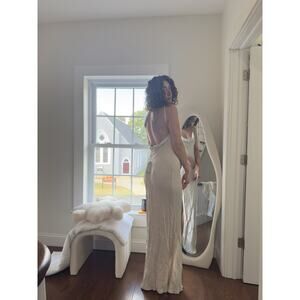 “Jade” Backless Maxi Dress in Bone (off-white) – brand new with tags. This slinky slip-style dress is pure elegance: it has a draped cowl neckline and ultra-low open back with skinny adjustable straps. A thigh-high side slit adds allure and ease of movement. The satin fabric is lightweight with a beautiful sheen; color “Bone” is a creamy beige/off-white. Size XL: fits US 12 (runs true with a bias-cut slinkiness; Bust ~40-42″). Originally about $100+ on Meshki’s site (style often sells for around $105). Condition: Perfect/unworn.