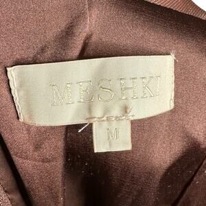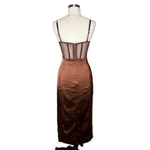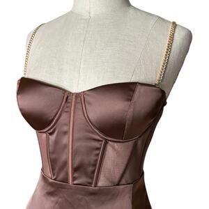 Talisa chain strap side split corset midi dress in chocolate brown from Meshki in women's size medium. One of the strap attachments has been resewn on the back as shown, otherwise great used condition.