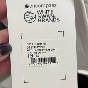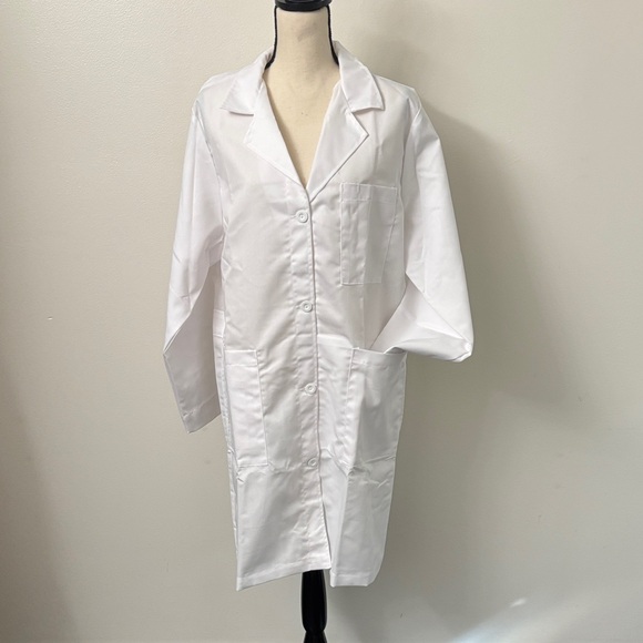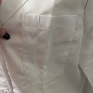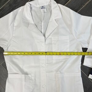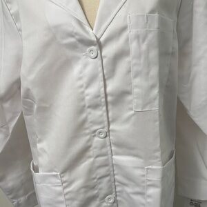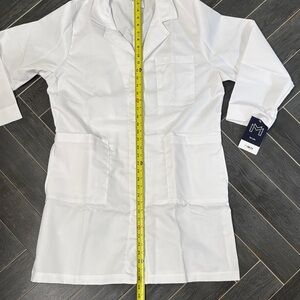 Elegant white lab coat by META. Features a classic design with practical pockets. NWT both top