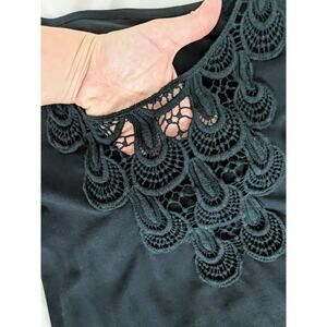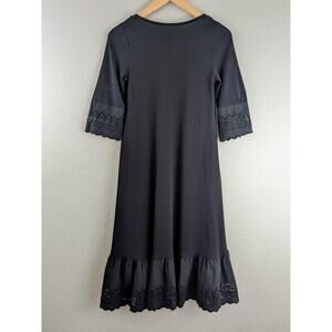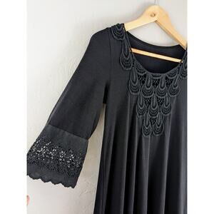 Stretchy, black midi dress with 3/4 sleeves. Size is "one size"—but please check measurements. Material is nylon and cotton, and very stretchy. Eyelet bell sleeves, and eyelet ruffle at bottom hem. Pretty crochet detail at bust. This dress could be very versatile: wear it at home and be comfy, at work (with a slip), or as a beach / swim cover up. Good used condition.