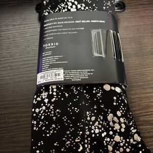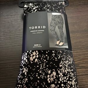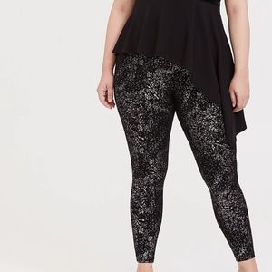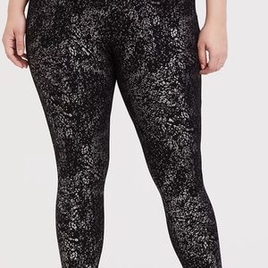 Feel edgy in our full length leggings with an allover silver metallic splatter design and a stretchy waistband that smoothes and shapes.