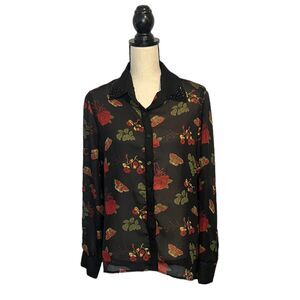 Metaphor Womens Size L Floral Black Button Down Semi-Sheer Blouse Beaded Collar