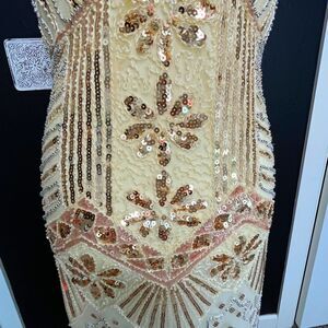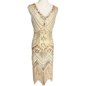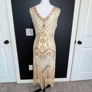 METME 1920s Flapper Sequin Fringe Dress Champagne Gold Art Deco Gatsby Size S