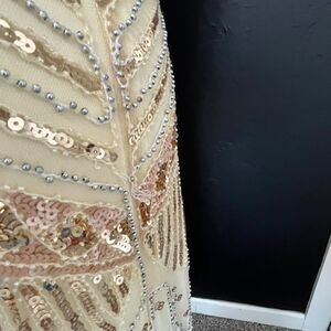 Features: Sleeveless, V-neckline, fully beaded and sequined overlay, fringe hem