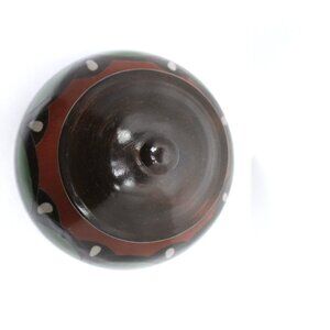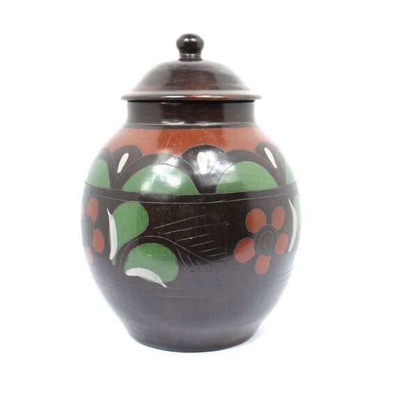 MEXICAN FOLK ART BURNISHED DARK BROWN CLAY POTTERY GINGER POT HAND-PAINTED FLORAL DESIGN IN RED GREEN & OFF WHITE