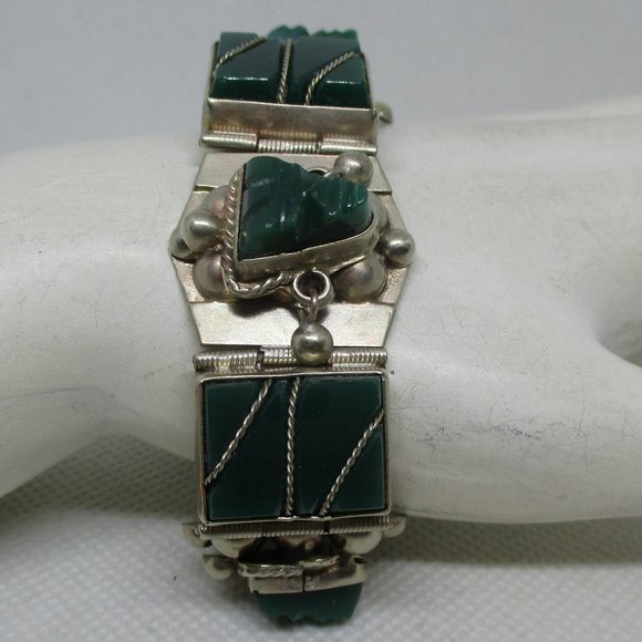 MEXICAN SILVER Green Onyx Tribal Masks Bracelet Gemstone Rectangles Sectional
