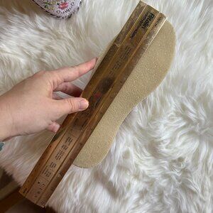 Mexico en la piel = Mexico in the flesh! These are handcrafted, beautiful traditional huaraches, or woven leather shoes. They are designed to stretch and mold to your feet after a few wears, so it is normal if they are a bit tight at first. Brand new, never worn, size 6 US. I've provided measurements against a ruler so that you can compare with other shoes you own. The sole is crepe rubber.