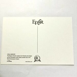 Vintage 4x6 inch postcard. The front depicts a riverboat cruise in front of the Mexico Pavilion at Epcot Walt Disney World. The back is empty of writing and postage, and reads "HOLA AMIGOS ! -- The Mexico Pavilion awaits more friends and amigos as the Friendship cruise makes another trip to the World Showcase in Epcot."