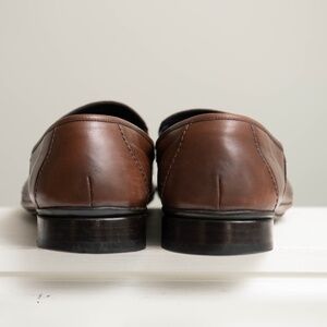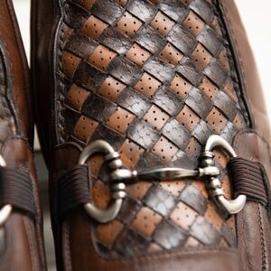 These MEZLAN Brown Leather Horse bit Loafers are a Men's Sz 13. Featuring a mixed leather two tone weave. This design is super rare! easy Slip on and rich colors! These shoes are in preowned condition with signs of wear, mostly on the bottom of the shoes. Please review pictures.