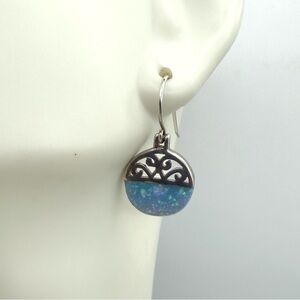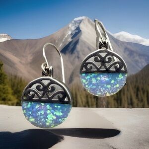 The MF Designer Opal 925 Sterling Silver Dangle Earrings are a stunning piece of fine jewelry featuring natural round opal stones in a multicolor hue. These vintage MF opal earrings are signed by the designer and crafted from high-quality sterling silver with a 925 metal purity. The dangle/drop style and bezel setting add a touch of elegance to the piece, making it a perfect accessory for any occasion.