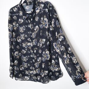 MG Women Button Up Blouse Plus Size 3X Blue Floral Artsy Sheer Office Career