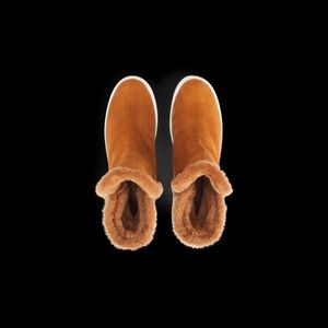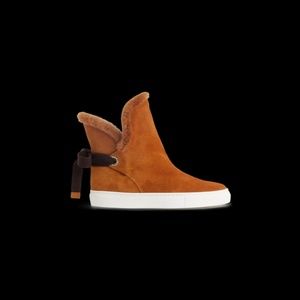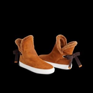 Water-resistant suede and leather meets genuine shearling in the new Cerchio shearling booties. Sleek, warm and unbelievably comfortable, these stylish, bow-back boots are guaranteed to make cold feet a thing of the past. (Treat with a water-repellent spray before wearing in wet or slushy conditions.)