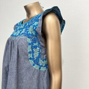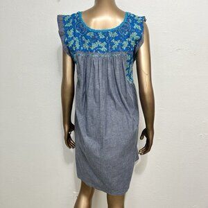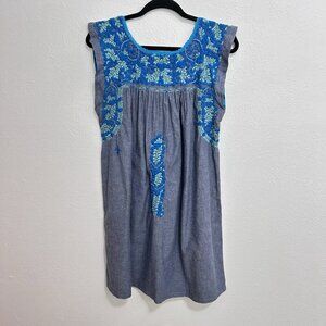 MI GOLONDRINA Flores Shift Dress Gray Blue Embroidered Sleeveless Oaxaca Size M