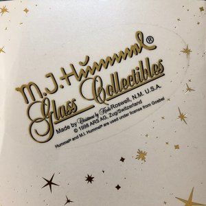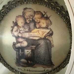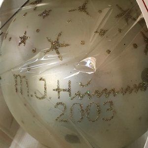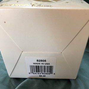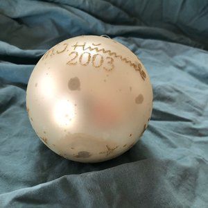 "Grandma's Story", a sweet 2003 ornament purchased by me many moons before I was a grandmother! In excellent structural condition, though the photos show areas where the frosted glass coating has become discolored over the years. Priced accordingly. The gold glitter looks as good as the day we got it. I don't know how we got such a sweet deal on it, aside from this is not an ornament made IN Germany, it is licensed and made in the USA. Approx 3" wide.