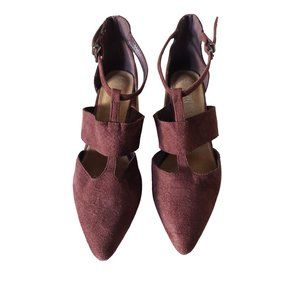 MI IM HEELS SIZE 9US POINTED TOE , STACKED BLOCK HEEL T STRAP BURGANDY
