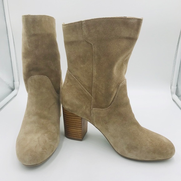 Effortlessly cool. Mia Cobain Stone suede leather mid calf booties are a staple. Mid calf shaft and almond- toe upper,