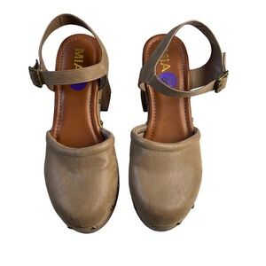 Elevate your shoe game with these stylish MIA Analie Block Heel Platform Clogs in a beautiful taupe color. The round toe and ankle strap accentuate your foot's natural beauty, while the buckle closure ensures a secure fit. Perfect for any occasion, whether it's a party or a casual day out, these shoes have a 3-inch platform height and a high block heel, measuring between 3-3.9 inches, to give you the perfect lift.
