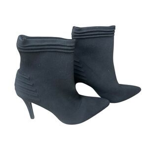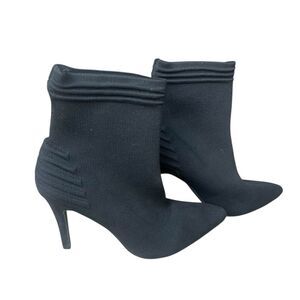 Keywords: MIA booties, black booties, fly knit, stiletto heel, pointed toe, ankle booties, chic, sophisticated, casual, evening wear, slip-on, textured pattern, all seasons, women's fashion.