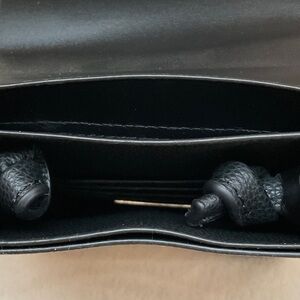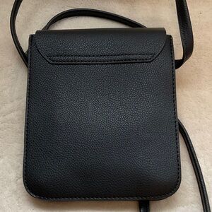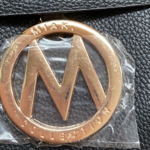 Chic black handbag featuring a bold gold emblem. Perfect for stylish outings.