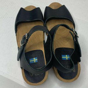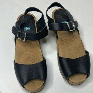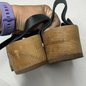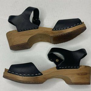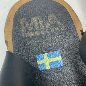 MIA Black Leather Wood Swedish Clogs Rubber Lug Soles EU 38